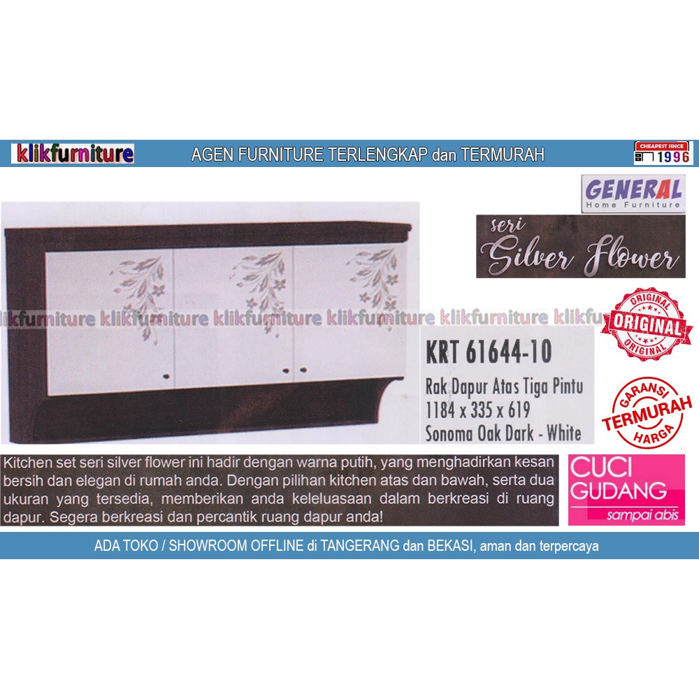 KHUSUS JADETABEK SAJA, DILUAR ITU HUBUNGI KAMI. Pemesanan Pilih Kurir Tersedia Buat Resi Surat Saja, Barang dikirim dirakit kurir toko (ongkos bayar ditempat)Informasi kontak dan toko/showroom offline bisa dilihat di detail akun kamihttps://shopee.co.id/klikfurniture atau via chatKRT 61644 GENERAL Kitchen Set Olympic Atas 3 Pintu- Rak dapur minimalis model terbaru- Ukuran 118.4 x 33.5 x 61.9 cm- Bahan Kayu Particle Board dilapisin foil kertas dan pvc- Knockdown system,precision maker,fast buildMohon dibaca :- Ongkir+instalasi oleh kurir kami mulai dari Rp 0 sd Rp 100.000,-(bayar ditempat, nego tergantung lokasi) / pengiriman(kalau beli beberapa item tetap dihitung sama).Total pembelian diatas 5 Juta BEBAS/FREE , tidak dikenakan biaya tambahan. Pemesanan pilih jne/jnt buat resi surat saja.- KHUSUS wilayah Jakarta, Depok, Tangerang, Bekasi- MOHON UNTUK TANYA STOK TERLEBIH DAHULU, karena takut terjual di toko-toko offline kamiKatalog lengkap untuk produk Kitchen Set General Olympic bisa dilihat disini :https://shopee.co.id/klikfurniture?page=0&shopCollection=13910041Katalog Lengkap Furniture General Olympic bisa dilihat disini :https://shopee.co.id/search?keyword=general&shop=21599820#kitchenset #graver #rakdapur #jualkitchenset#kitchensetatas #kitchensetbawah #kitchensetsudut#rakdapuratas #rakdapurbawah------ klikfurniture : agen resmi produk furniture termurah sejak 1996 ------Diskusi dan Chat akan direply Senin-Sabtu Jam 08.00 - 17.30 (selain tanggal merah).Terima