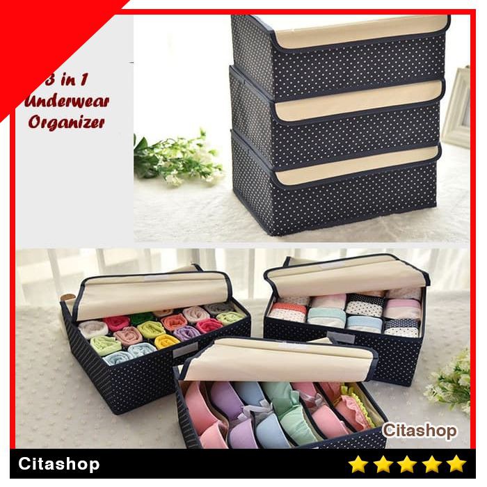 3in1 Underwear Organizer POLKADOT Bahan lebih tebal- bisa ditumpukRED POLKA = KOSONGGGREADY : NAVY POLKAWanita suka koleksi bra dan celana dalam karena dengan pakaian dalam yang beraneka motif, wanita jadi keliatan sexy saat memakainya. Namun jika dibuka lemari pakaian wanita pasti keliatan bra dan celdam numpuk gak beraturan, jadi malu deh kalau dilihat orang.Lalu bagaimana merapikan pakaian dalam yang berantakan $1$2 Cukup dengan memakai underwear organizer 3in1. Satu set organizer terdapat 3 pcs oranizer yang bagian dalamnya bersekat untuk tempat bra, celana dalam, kaos kaki/syal.jilbab.Tiap organizer ada tutupnya, mencegah kemasukan debu. Dapat ditumpuk jadi 3 susun, terbuat dari kain oxford tebal, bagian dalam terdapat lapisan papan tipis sehingga kuat dan kokoh untuk ditumpuk. br/ br/ Dengan underwear organizer anda dapat merapikan Bra, celana dalam, kaos kaki sehingga tersusun rapi dan mudah dicari1 set underwear terdiri dari 3 pcs :- 1 pc tempat bra size : 33 x 24 x 12 cm, muat 12 pcs bra- 1pc tempat celana dalam size : 33 x 24 x 12 cm, muat 36 pcs celana dalam- 1pc tempat kaos kaki, topi lipat, syal size : 33 x 24 x 12 cmMotif sesuai di ga
