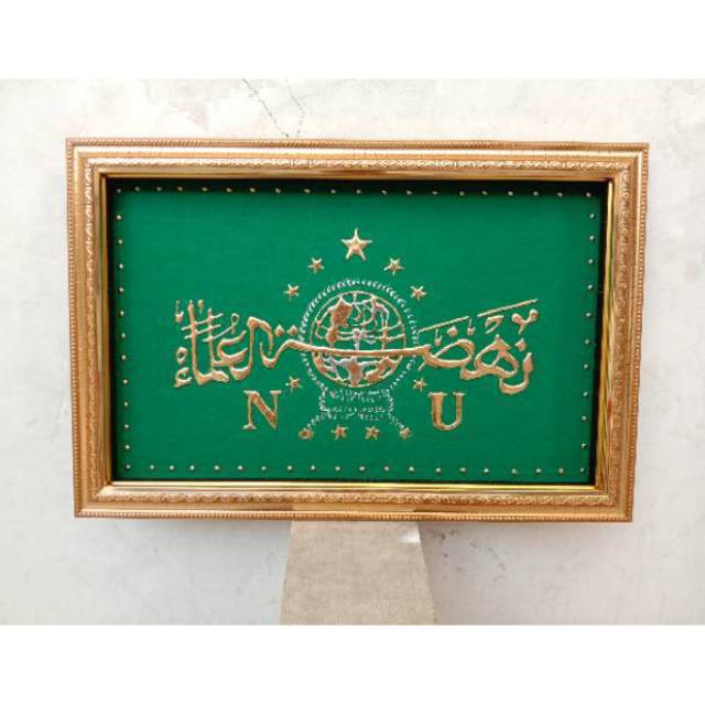 kaligrafi lambang NU ukuran 65cm x 45 cm pigura double frame menjorok bahan terbuat dr tinta emas timbul dasaran karpet yg berwarna warni,, pigura polyfream ada kacanya , .... NB : ADA TAMBAHAN ORDER PALET KAYU UNTUK PENGIR