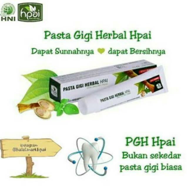 Pasta Gigi Herbal HPAIPasta Gigi Herbal HPAI mengandung herbal : Miswak, Sirih, Mint dan Pinang. Pasta Gigi Herbal HPAI berupaya sedikit mungkin menggunakan bahan-bahan kimiawi dan memperbanyak kandungan bahan-bahan alami.Misalnya untuk deterjen, Pasta Gigi Herbal HPAI tidak menggunakan Sodium Lauryl Sulfate (SLS) yang dapat menyebabkan ulser pada orang bermulut kering, tidak menyebabkan efek samping yang merugikan bagi jaringan lunak di dalam rongga mulut, dan tidak menyebabkan iritasi jaringan lunak mulut.#pghhpai #pastagigiherbal