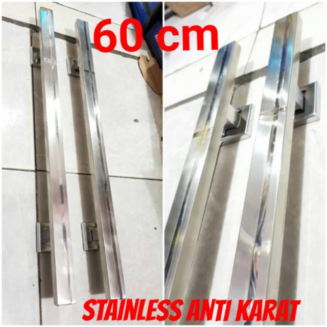 Ihandle pintu stainless model minimalis panjang 60cm berbahan stainless tebal ANTI KARAT. kaki handle berbentuk KOTAK.harga tersebut untuk 1set = 2 g