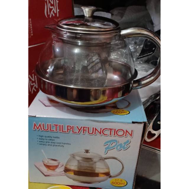 Teko+Saringan Teko/Kopi Multilply Function Pot 600ml 37-B Stainless Steel Dengan teko saringan teh ini, penyajian teh tubruk menjadi sangat praktis. Tinggal tuangkan air panas + gula ke dalam kontainer, kemudian masukkan teh tubruk ke saringan dan pasang ke tekonya. Secara otomatis teh tubruknya terendam di dalam air dan sari-sari teh menyatu dengan air.Air teh yang dihasilkan pun jernih karena ampas tehnya tertahan oleh saringan. Saringannya terbuat dari logam sehingga mudah dibersihkan dan tahan lama. Selain teh, teko ini juga dapat digunakan untuk menyajikan kopi tubruk. Kini siap hadir di rumah AndaSpesifikasi Produk :- The Body Stainless Steel- The Pot is made of Glass- The Out Shell and collender is made of stainless Steel- Paket : Teko dan Saringan Logam - Volume : 600 ml#tekokopi#tekoteh#teapot#teapotm