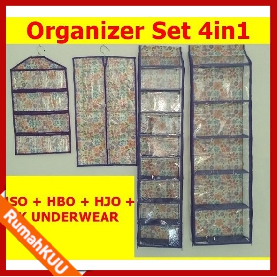 ORGANIZER 1SET 4in1 FULL RESLETING(HJO,HSO,HBO&RAK AKSESORIS/CD)Detail :1 SET TERDIRI DARI 4 MACAM BARANG / HANGER ( WARNA dan MOTIF SERASI) :- HJO : 5 tingkat, Gantungan Hanger Jilbab / Hijab / Kerudung (PAKAI RESLETING)- HBO (ukuran 140 x 40) : 5 tingkat, Gantungan Hanger Tas (PAKAI RESLETING)- HSO (ukuran 141 x 30) : 8 tingkat, Gantungan Hanger Sepatu (PAKAI RESLETING)- RAK UNDERWEAR 16 sekat (ukuran 70 x 40 )- Bahan: Spondbound, mika, triplek (sekat)NB: MOTIF SESUAI PRODUKSI PABRIK TERA